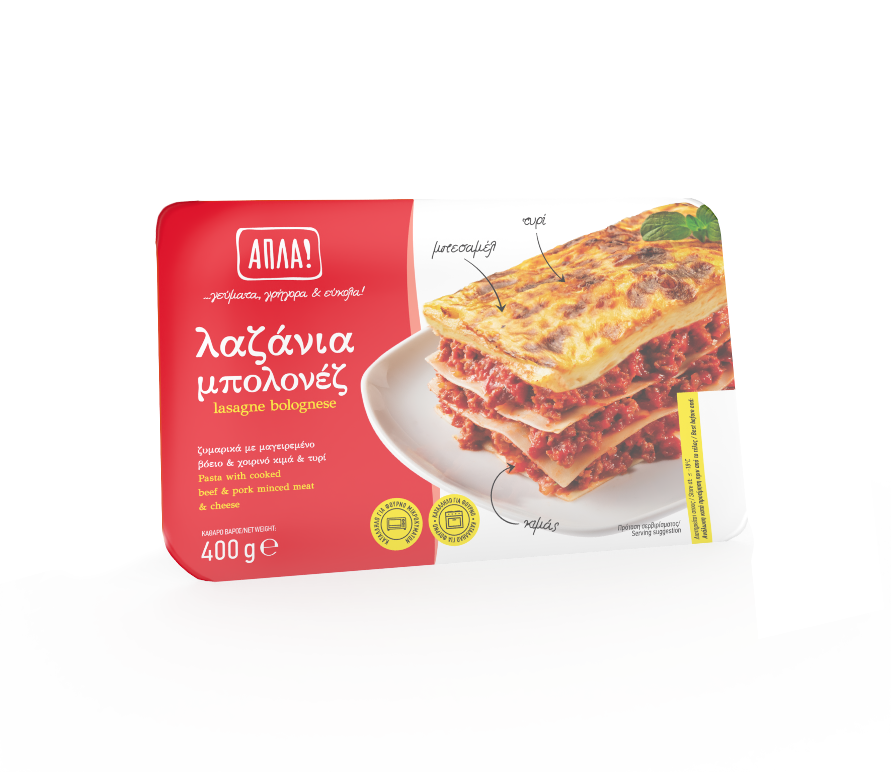 ΑΠΛΑ! - Γεύμα με ζυμαρικά (22%), μαγειρεμένο χοιρινό και βόειο κιμά και σκληρό τυρί. Προϊόν ταχείας κατάψυξης.