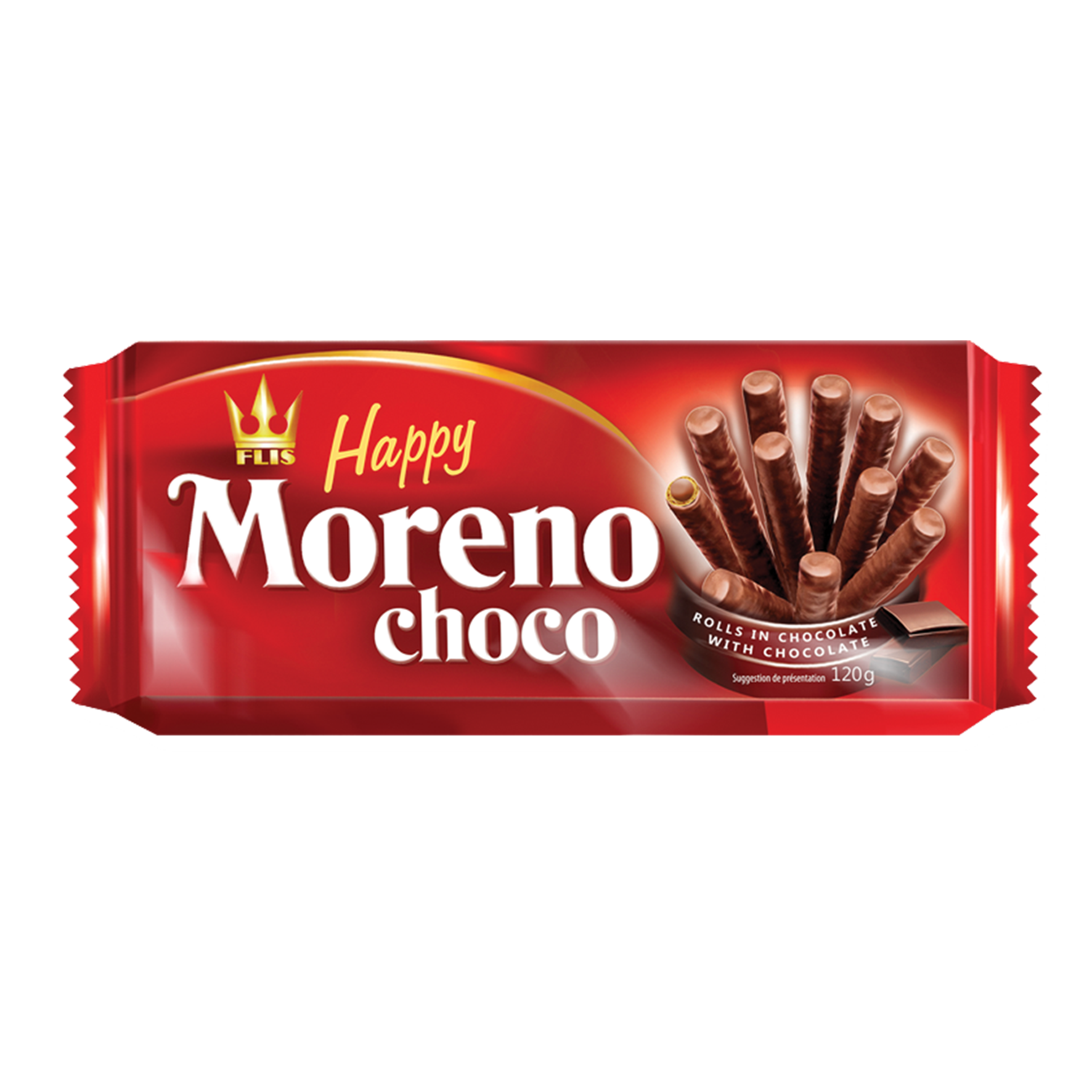 Happy Moreno - Γκοφρέτες γεμιστές με κρέμα με γεύση σοκολάτας (43,2%) και επικάλυψη σοκολάτας γάλακτος (30,8%).