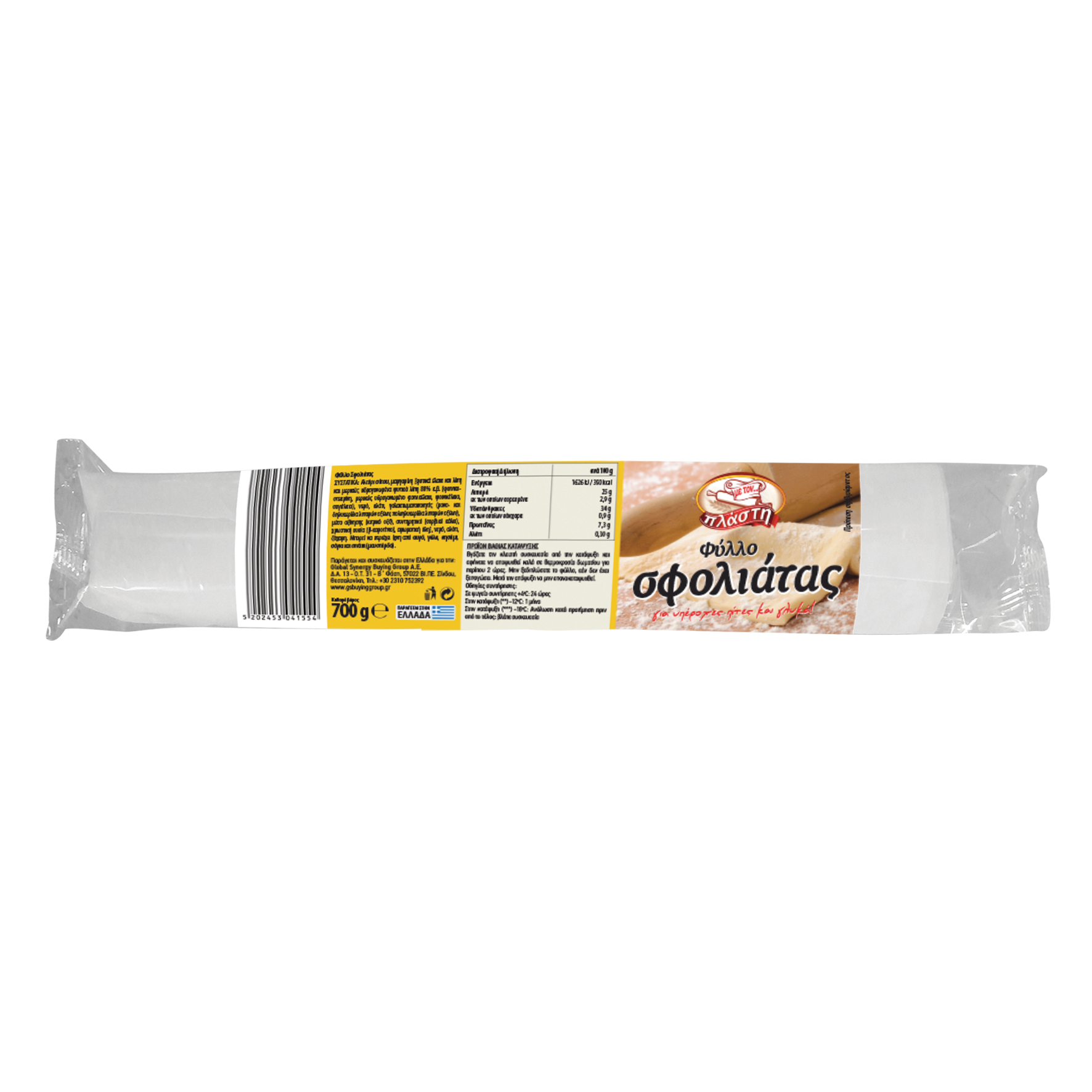 Αλεύρι σίτου, μαργαρίνη [φυτικά έλαια και λίπη και μερικώς υδρογονωμένα φυτικά λίπη 80% κ.β. (φοινικοστεαρίνη, μερικώς υδρογονωμένο φοινικέλαιο, φοινικέλαιο, σογιέλαιο), νερό, αλάτι, γαλακτωματοποιητές (μονο- και διγλυκερίδια των λιπαρών οξέων, πολυγλυκερίδια λιπαρών οξέων), μέσο οξίνισης (κιτρικό οξύ), συντηρητικό (σορβικό κάλιο), χρωστική ουσία (β-καροτένιο), αρωματική ύλη], νερό, αλάτι, ζάχαρη.