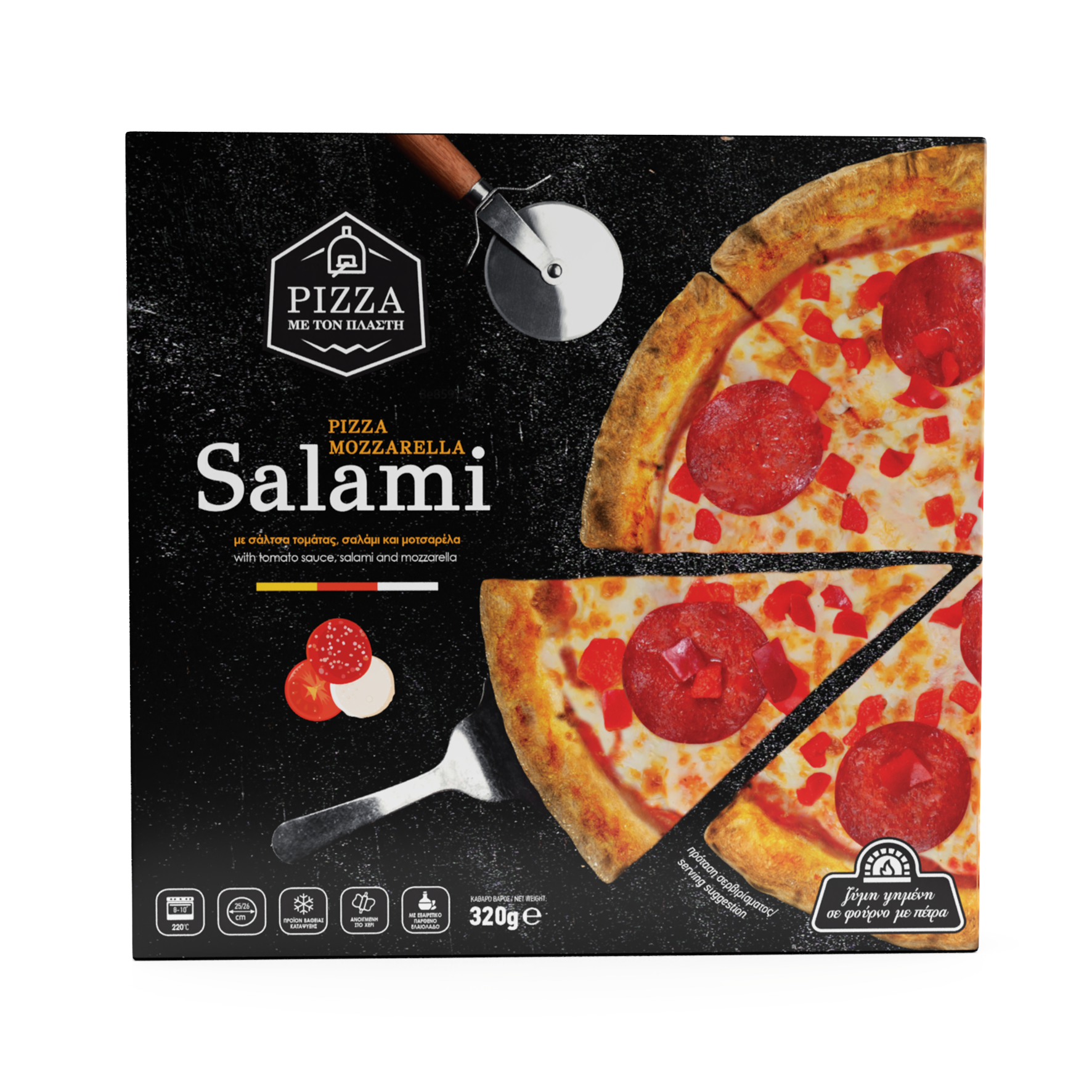 ΜΕ ΤΟΝ ΠΛΑΣΤΗ – Πίτσα με σάλτσα τομάτας, σαλάμι, μοτσαρέλα και κόκκινες πιπεριές 320g