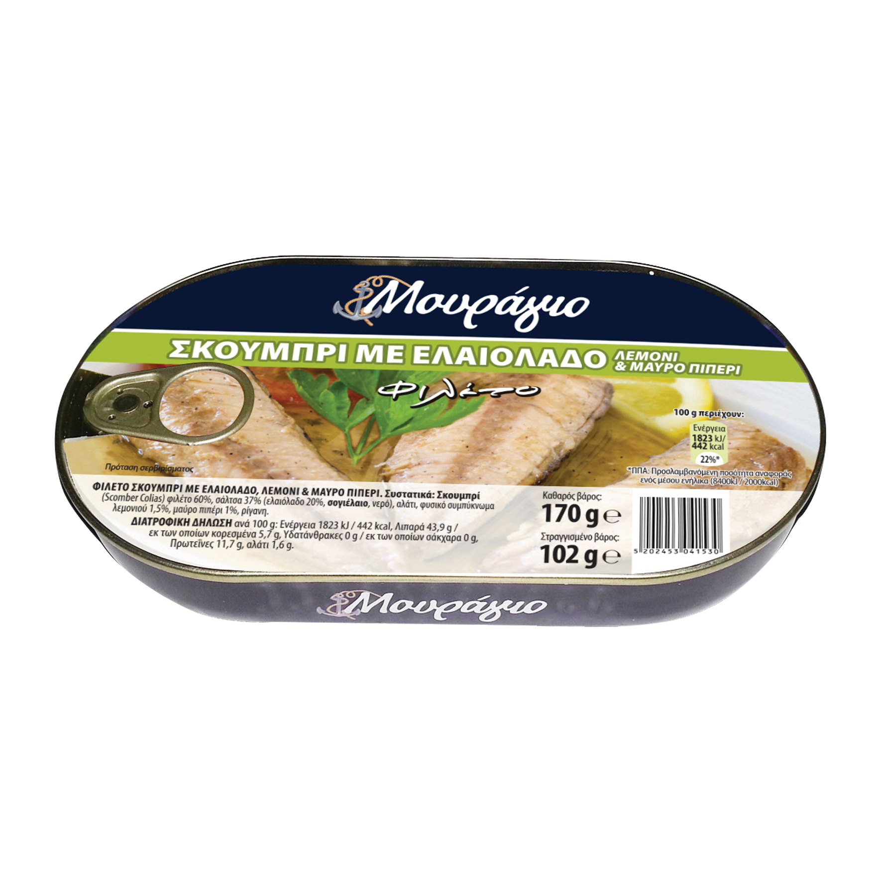 Σκουμπρί (Scomber Colias) φιλέτο 60%, σάλτσα 37% [φυτικό έλαιο (ελαιόλαδο 20%), φυτικό έλαιο (σογιέλαιο), νερό], αλάτι, φυσικό συμπύκνωμα λεμονιού 1,5%, μαύρο πιπέρι 1%, ρίγανη.