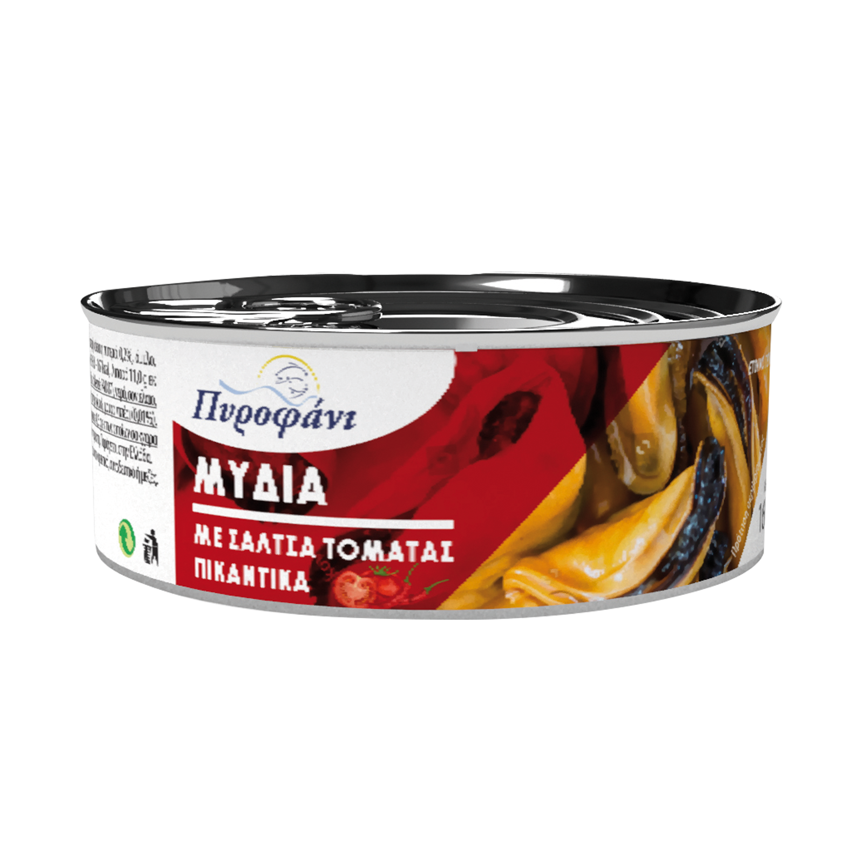 Μύδια 60% (Mytilus chilensis), νερό, σογιέλαιο, τοματοπολτός 6%, τομάτες 4%, κρεμμύδι, ζάχαρη, αλάτι, μαϊντανός, καυτερή κόκκινη πιπεριά 0,2%, άμυλο, σταθεροποιητής (κόμμι γκουάρ), κόκκινο πιπέρι γλυκό, μαύρο πιπέρι (0,01%).